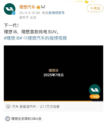 3月3日,理想汽车宣布,旗下首款纯电SUV—— 理想i8将于今年7月发布上市,同时发布首支预告视频。