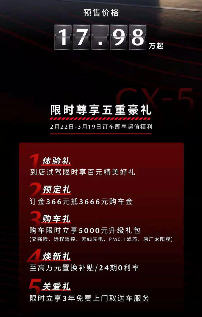 网易汽车2月22日报道 日前,新款马自达CX-5(参数丨图片)正式开启预售,新车共推出6款车型,预售价格区间为17.98-24.58万元,作为中期改款车型,新车对外观部分细节进行全新设计,整体更加精致。除此之外,官方还推出“预售期尊享万元补贴限时礼遇”五重豪礼,不仅有366元抵3666元购车金,更有至高万元的置换补贴。
