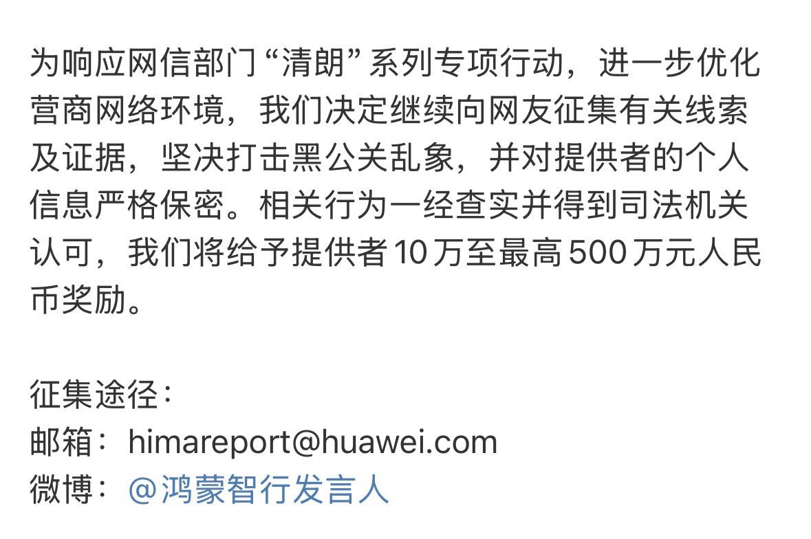 此外,鸿蒙智行还向网友征集有关线索及证据,相关行为一经查实并得到司法机关认可,将给予提供者10万元至最高500万元人民币奖励。
