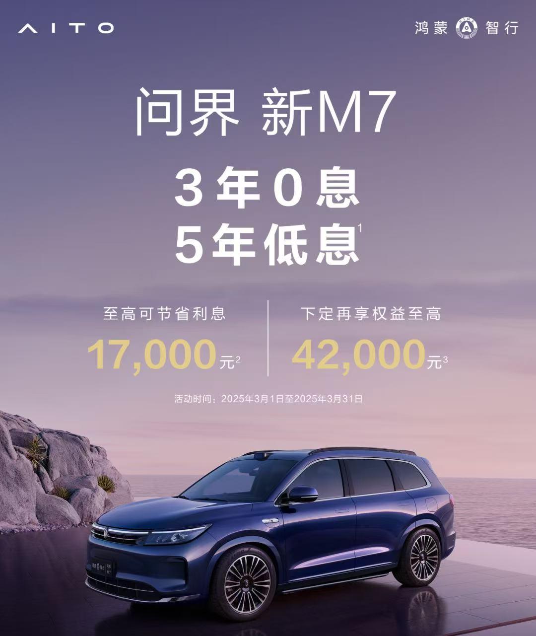 比如,问界新M7新增3年0息、5年超低利息限时金融政策,首付仅需7.98万元起,至高可省1.7万元;智界R7推出3年0息、5年超低息限时金融政策。即日起购车首付7.98万元起,最高可立省1.7万元;智界新S7推出3年0息、5年低息限时金融政策,即日起购车首付仅需7.98万元起,至高可省1.7万元。