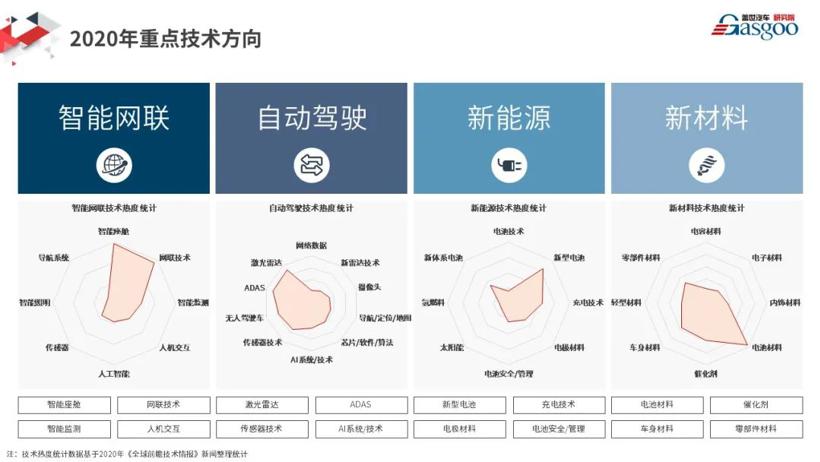 《2020全球前瞻技术情报年鉴》包含智能网联板块的技术资讯284条,自动驾驶板块284条,新能源板块144条,新材料板块132条。以下将对各大板块的热点技术方向与发展趋势加以总结分析。