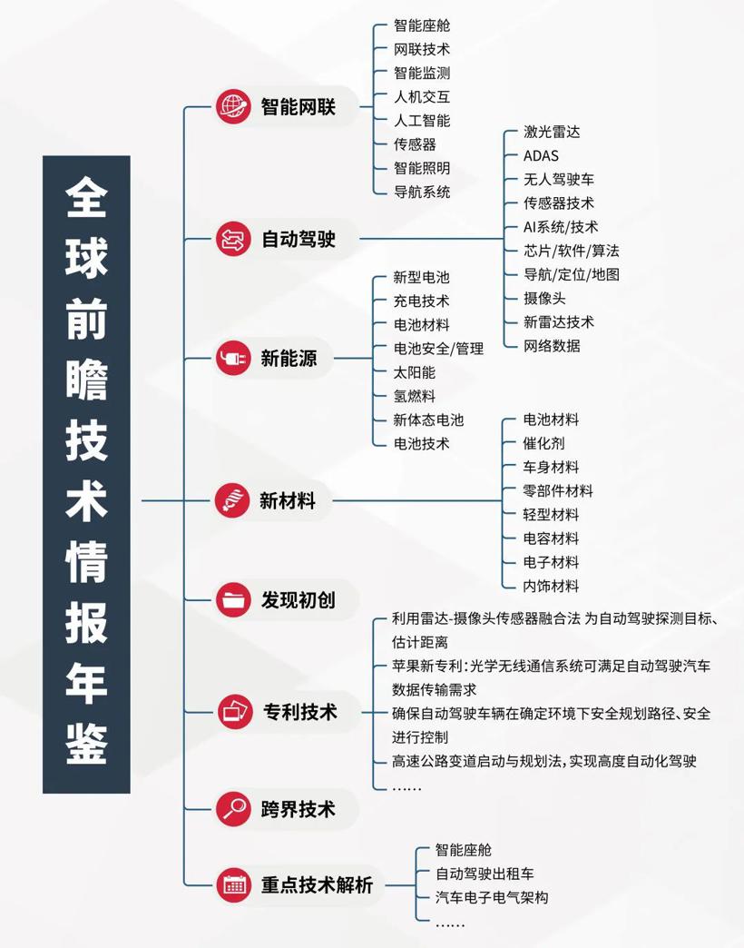 产品特色:围绕全球汽车智能网联、自动驾驶、新能源、新材料等主题方向,挖掘具备潜力的国内外初创公司,梳理前沿专利技术和跨界技术、解析重点技术,为行业用户提供全面且具有前瞻性的技术信息