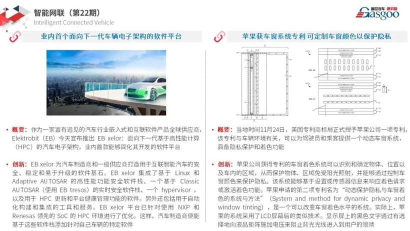 2020年的“重点技术解析”板块共计12个专题,对年度热点技术如电子电气架构(上图为两页节选)、车载信息娱乐系统 、高精度地图 、驾驶监控系统等进行了市场格局分析与未来趋势展望。