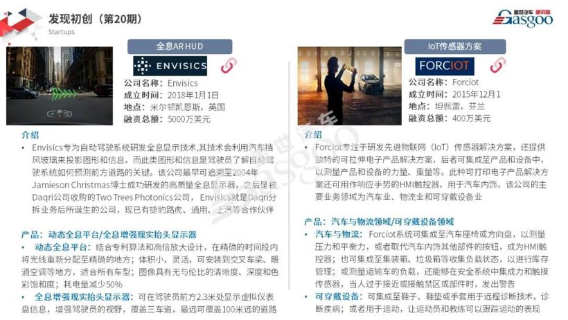 《2020全球前瞻技术情报年鉴》在 “发现初创”板块共计挖掘了48家初创公司,集中在自动驾驶、人工智能、网联技术、新能源等技术领域,其中多家初创公司在2020年获得知名公司投资或合作,如英国AR-HUD初创公司Envisics 曾获得上汽、通用投资,并在2021CES期间与松下达成合作,共同开发新一代HUD;美国AI初创公司Scale在年底估值或超30亿美元。