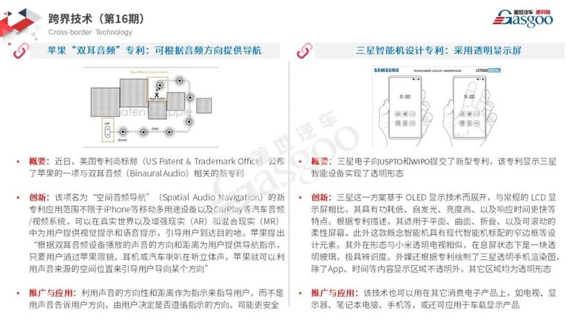 2020年全年共计整理24个专利技术,48个跨界技术。跨界技术涉及消费电子、人工智能、新材料等多个领域,并探讨这些跨界技术未来在汽车领域的推广与应用的可能性。