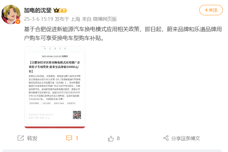 合肥经开区将对换电模式应用推广企业给予专项奖补合肥经开区将对换电模式应用推广企业给予专项奖补3月6日,蔚来副总裁沈斐在其个人社交平台上发文表示,基于合肥促进新能源汽车...……2024-09-18