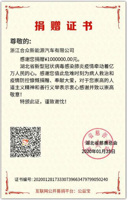 【哪吒汽车向湖北慈善总会捐赠100万元人民币】
