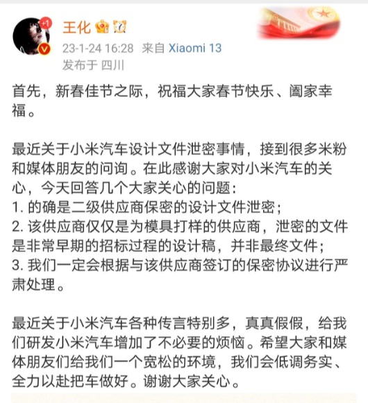 首先,王化下场,对小米造车受阻进行辟谣,称该消息不实,且不存在所谓品牌需要批准的说法。随后,关于小米汽车设计文件泄密一事,也是王化站了出来,紧急回应: