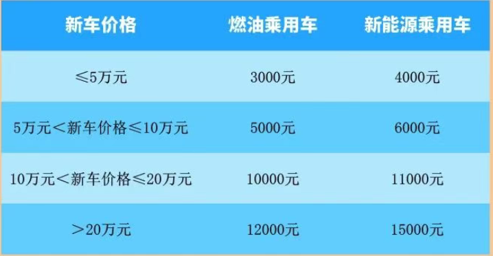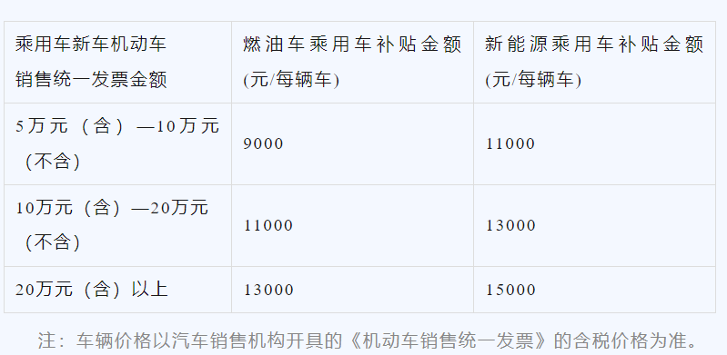 新车价格5万元(含)以上10万元(不含)以下的,燃油乘用车补贴8000元、新能源乘用车补贴10000元;新车价格10万元(含)以上20万元(不含)以下的,燃油乘用车补贴10000元、新能源乘用车补贴12000元;新车价格20万元(含)以上的,燃油乘用车补贴13000元、新能源乘用车补贴15000元。