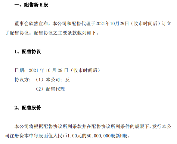 公告显示,配售股份相当于现有已发行10.48亿股H股的约4.77%,以及本公告日期已发行股份总数的约1.75%。配售股份约占经扩大已发行H股数目的约4.55%及配售股份配发及发行后经扩大已发行股份总数的约1.72%。如果所发行股份全部配售,预计所筹金额约138亿港元,净融资137.44亿港元。