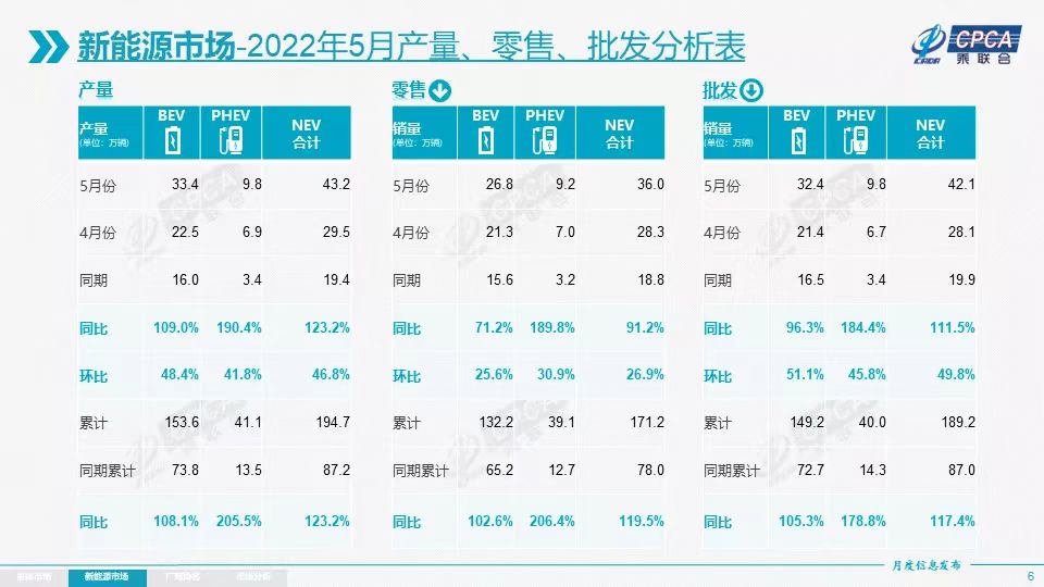 5月拉动车市环比增长的强大推力还是新能源汽车。数据显示,5月新能源汽车产量达到43.2万辆,同比增长123.2%,环比增长46.8%;零售达到36万辆,同比增长91.2%,环比增长26.9%;批发量达到42.1万辆,同比增长111.5%,环比增长49.8%。从三项指标来看,新能源乘用车5月环比改善超预期,形成了生产强于批发、供给良好复苏的局面。